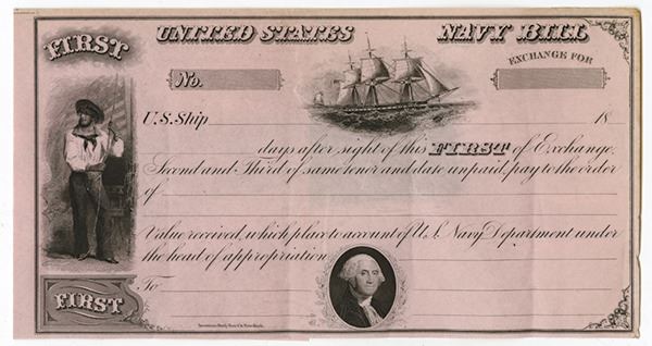 U.S. (Issued worldwide where ever they were used by the Navy), 18xx (ca.1850-60's), Remainder First of Exchange, Sailor on left, sailing ship middle, George Washington at bottom. Black on light pink paper, ABNC.