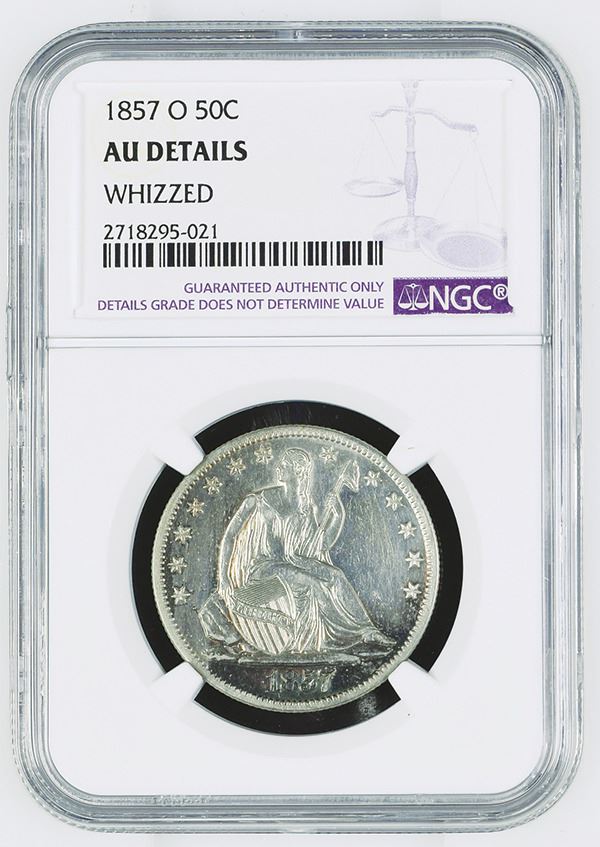 50 Cents, 1857 O, NGC graded AU Details with comment "Whizzed".