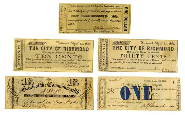 Includes (4) pieces from the City of Richmond for 10 Cents, 30 Cents, 1 Dollar, and 1.75 Dollars; also included 1 Dollar from the County of Brunswick VA. The latter Fine, the rest Very Fine or better.