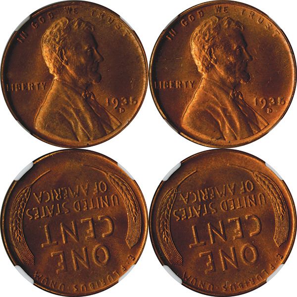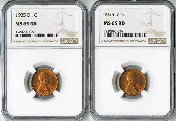 1 Cent, 1935 D, KM# 132, NGC graded MS 65 RD. (2) pieces.