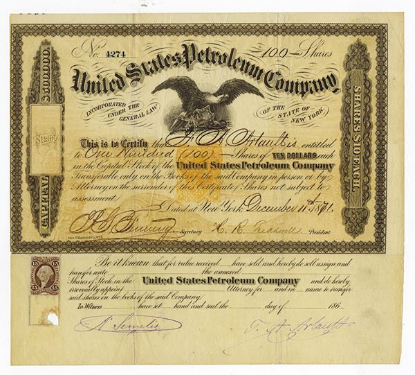 New York. 100 Shares Capitol Stock Issued and Uncanceled Certificate. Black print with a black border and orange under print. Vignette of an American Bald Eagle at center of certificate. Revenue stamp at bottom left corner. Fine condition.