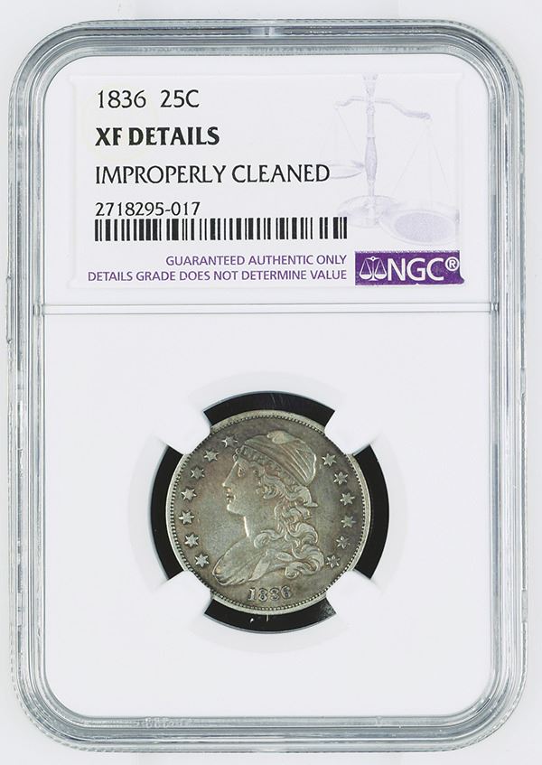 25 Cents, 1836, NGC graded XF Details with comment "Improperly Cleaned".