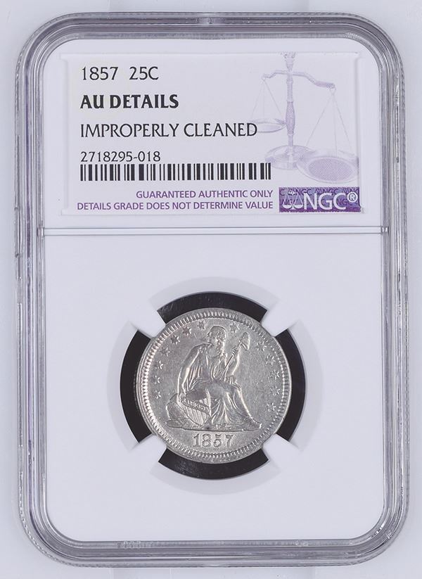 25 Cents, 1857, NGC graded AU Details with comment "Improperly Cleaned".