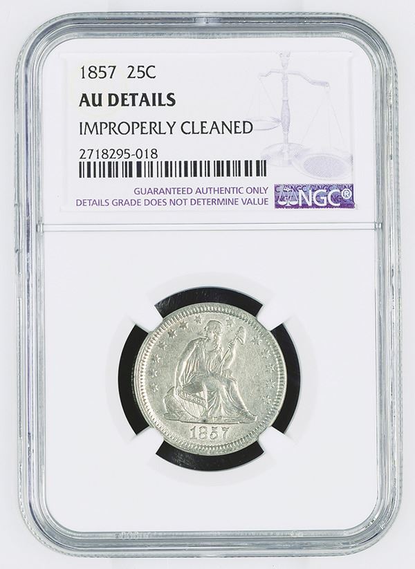 25 Cents, 1857, NGC graded AU Details with comment "Improperly Cleaned".