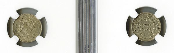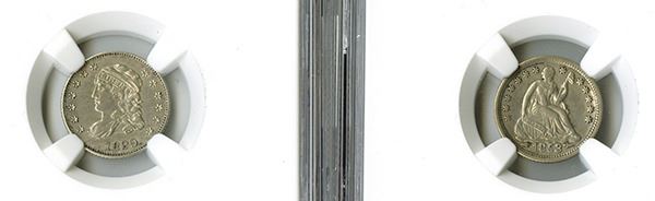 Lot includes Half Dime, 1829, NGC graded AU 58; and Half Dime, 1853, "Arrows", NGC graded AU Details with comment "Improperly Cleaned". (2) pieces.