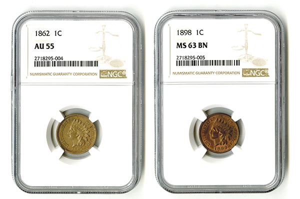 Lot includes 1 Cent, 1862, NGC graded AU 55; and 1 Cent, 1898, NGC graded MS 63 BN. (2) pieces.
