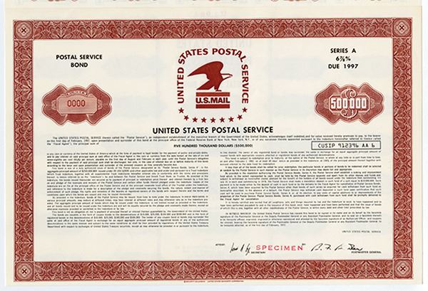 Washington, D.C., Specimen Bond. Feb.1, 1972. $500,000 Series A, 6 7/8%, Due 1997, Coupon Bond. Red-brown border and logo. Post Office Logo in middle with eagle on top of "U.S.Mail". Red "Specimen" overprint, POC's. Uncirculated. Rare U.S. Government Federally related Bond for this well known institution. Federated BNC.