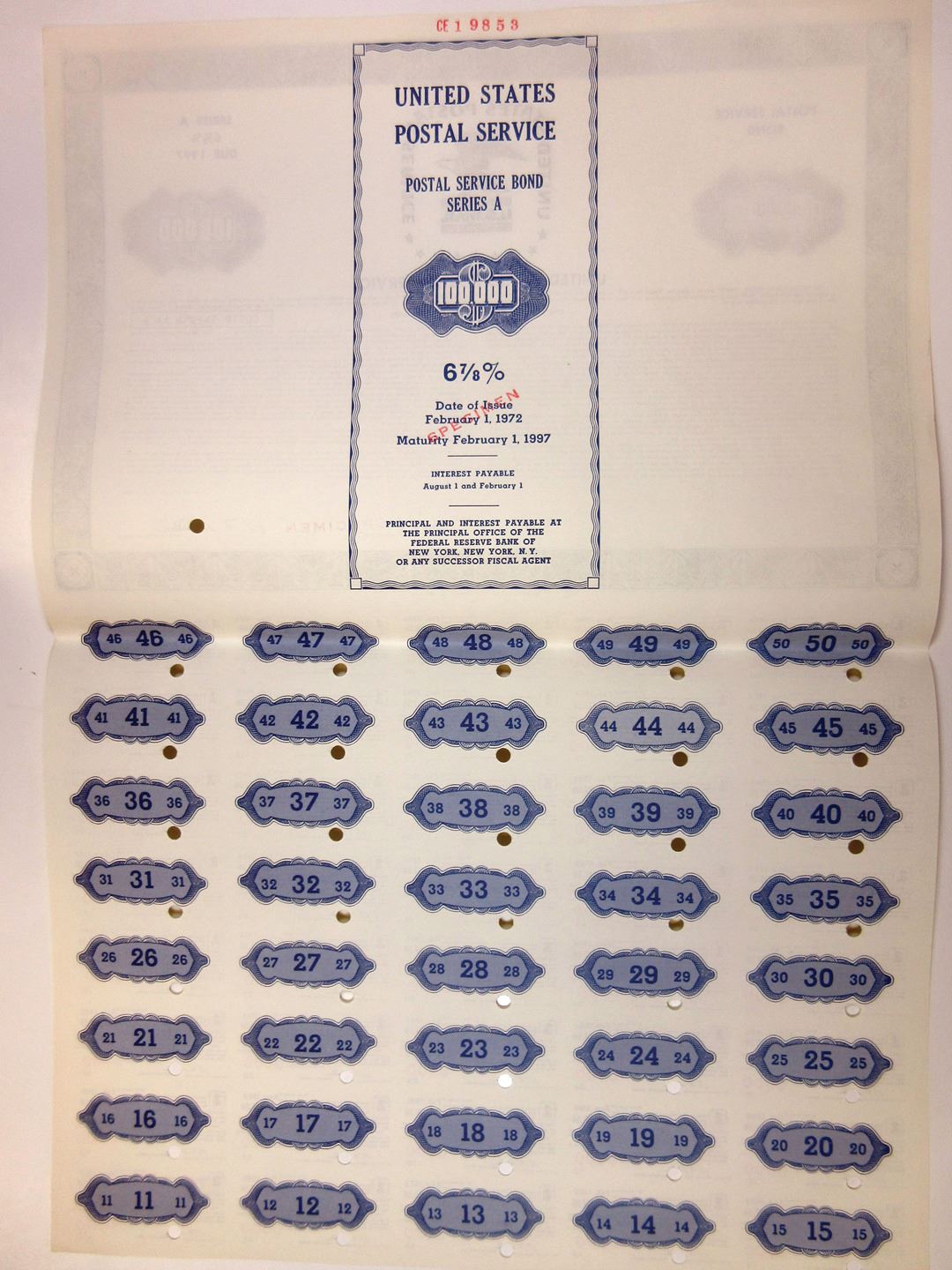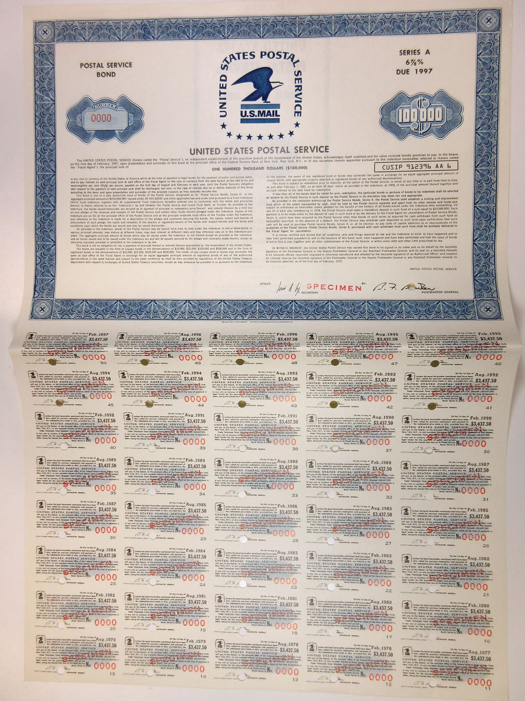 1972. $100,000 Specimen 6 7/8% Specimen Coupon Bond, Black text with blue border, U.S. Mail logo at top center. Red specimen overprint, 0000 serial numbers, and POCs. VF condition, SC-USBN.