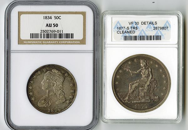 Includes Silver Trade Dollar, 1877 S, KM# 108, ANACS graded VF 30 Details with a comment of "cleaned"; and 50 Cents, 1834, KM# 37, NGC graded AU 50. (2) pieces.