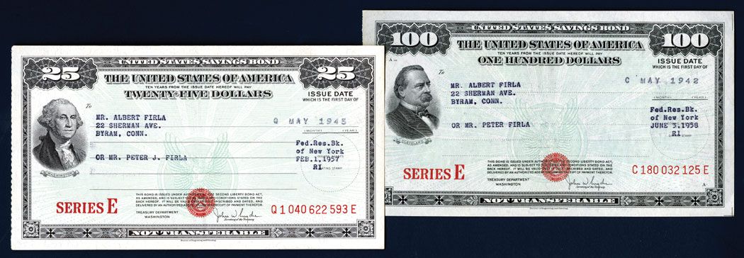 Lot of 2 issued Series E bonds, Includes 1945, $25 and 1942, $100, both with Snyder Signatures, both AU-Unc. Printed by the BEP.
