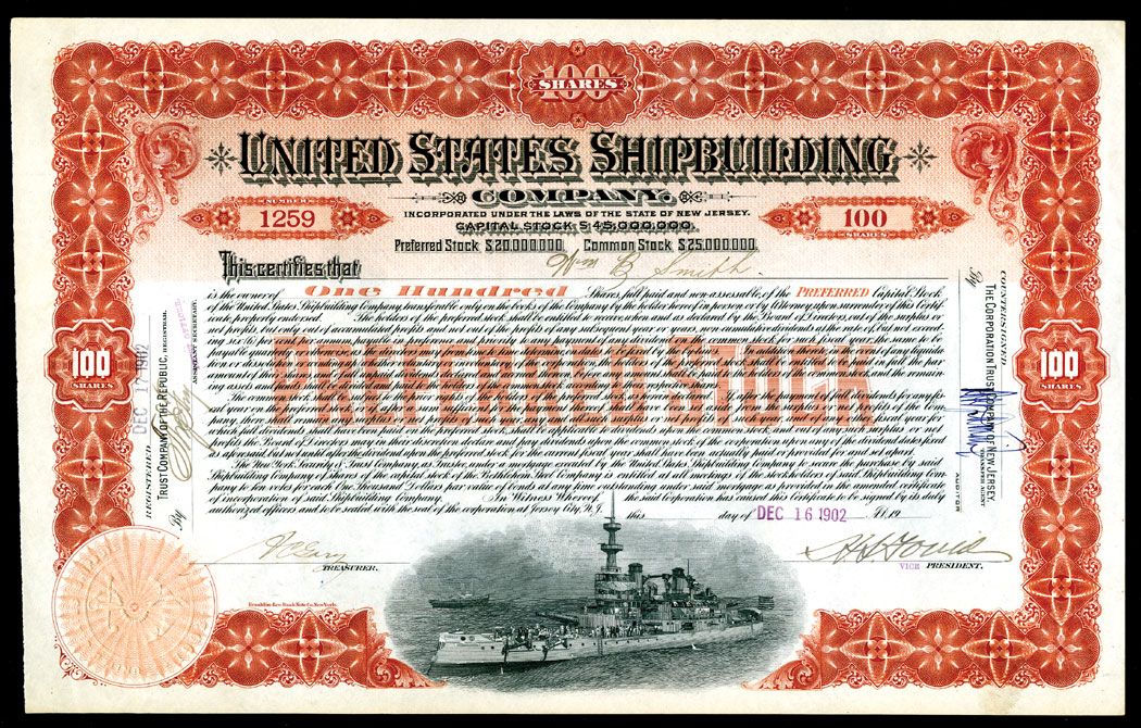 New Jersey, 100 Shares I/U, Burnt-orange border and underprint with impressive battleship on bottom, XF condition, FLBNC. Rare issued and extremely attractive.
