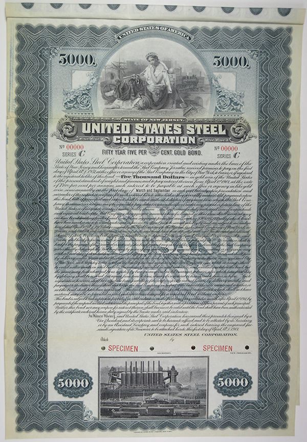New Jersey, 1901. $5000 Specimen Series "C" 5% Gold Coupon Bond, Black text with blue-gray border and undertint, Allegorical seated woman with American shield at top. Red specimen overprints, "00000" serial numbers, POC's. VF condition, printed by ABNC. J. P. Morgan formed U.S. Steel on March 2, 1901 (incorporated on February 25) by financing the merger of Andrew Carnegie's Carnegie Steel Company with Elbert H. Gary's Federal Steel Company and William Henry "Judge" Moore's National Steel Company for $492 million ($15.12 billion today). At one time, U.S. Steel was the largest steel producer and largest corporation in the world. It was capitalized at $1.4 billion ($43 billion today), making it the world's first billion-dollar corporation. Historic first issue bond.