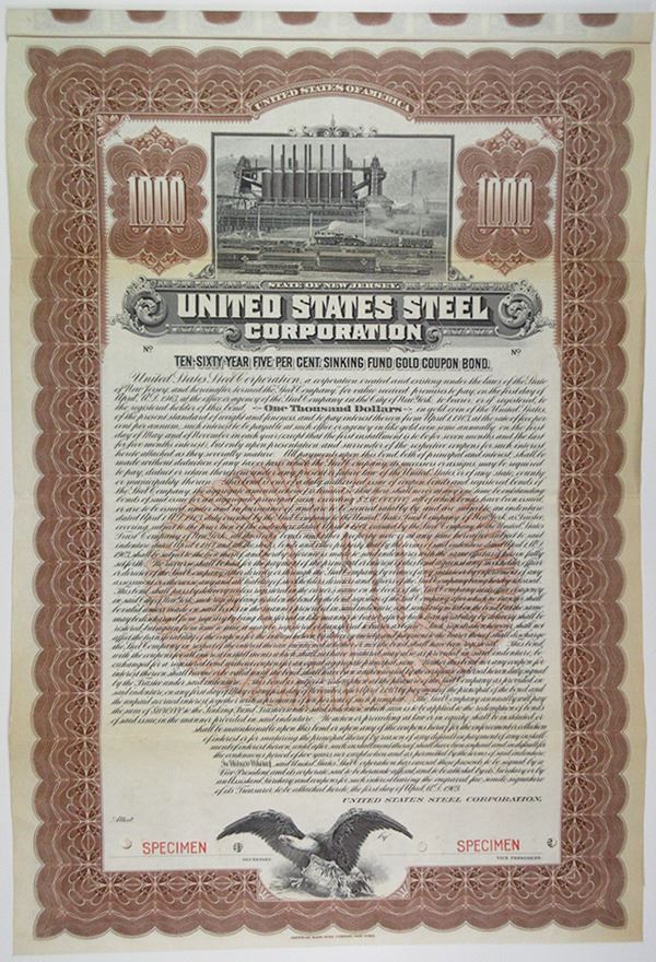 New Jersey, 1903. $1000 Specimen 5% Sinking Fund Gold Coupon Bond, Black text with brown border and undertint, Scene of trains passing by industrial factory at top. Red specimen overprints, POC's, VF condition. Printed by ABNC. J. P. Morgan formed U.S. Steel on March 2, 1901 (incorporated on February 25) by financing the merger of Andrew Carnegie's Carnegie Steel Company with Elbert H. Gary's Federal Steel Company and William Henry "Judge" Moore's National Steel Company for $492 million ($15.12 billion today). At one time, U.S. Steel was the largest steel producer and largest corporation in the world. It was capitalized at $1.4 billion ($43 billion today), making it the world's first billion-dollar corporation.