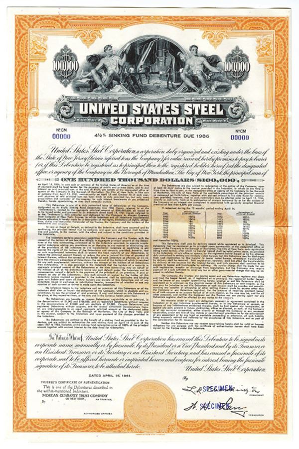 New Jersey. $100000 Specimen 4 1/2% Sinking Fund Debenture Coupon Bond, Black print on orange border and under tint, Allegorical figures flanking men in steel mill, Specimen overprints and POC's, VF-XF condition, ABNC.