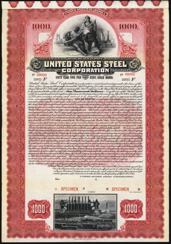 New Jersey, 1901, $1000, 50 Year 5% Gold Specimen Bond, Black on pink border and underprint, Vignette bottom center of locomotives at steel plant with standing allegorical woman top center holding a sword in front of steel factory on right and Brooklyn bridge on left allegorical man beside her embracing locomotive, Red SPECIMEN overprints and POC's, red s/n Ò00000Ó, VF-XF condition, ABNC. These bonds are from the U.S. Steel 1901 IPO. Company was formed by J.P. Morgan and attorney Elbert Gary by combining Andrew Carnegie's Carnegie Steel, Gary's Federal Steel and William Henry Moore's National Steel for $492 million.