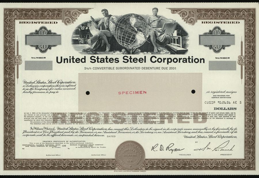 Delaware, ND, $-, 5 3/4% Convertible Subordinated Specimen Bond, Black on brown border and underprint, Allegorical men with steel manufacturing behind them flanking a globe top center, Red SPECIMEN overprint and POC's, VF-XF condition, SCBNC.