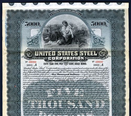 New Jersey, 1901, $5000, Series A 50 Year 5% Gold Specimen Bond, Black on blue border and underprint, Steel manufacturing plant and rail yards bottom center with allegorical woman sitting top center with city behind her, POC's red SPECIMEN overprints and red s/n “00000 “, VF condition, ABNC.