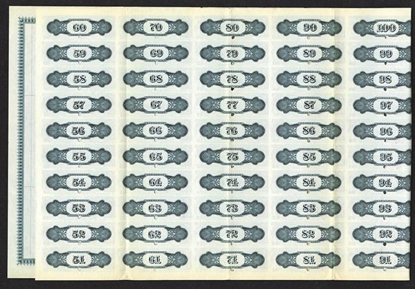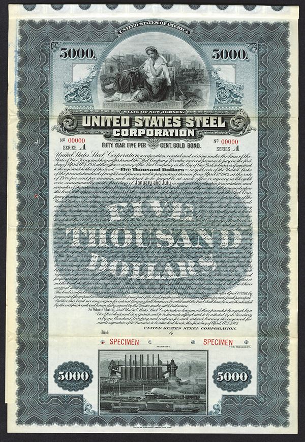 New Jersey, 1901, $5000, Series A 50 Year 5% Gold Specimen Bond, Black on blue border and underprint, Steel manufacturing plant and rail yards bottom center with allegorical woman sitting top center with city behind her, POC's red SPECIMEN overprints and red s/n "00000", VF condition, ABNC.