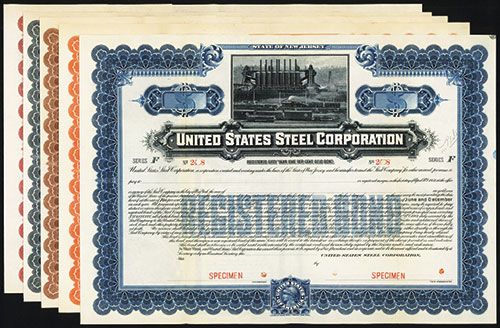 New Jersey, 1901, Registered 50 Year 5% Gold Specimen Bonds, Series A,B, C, D, F, Black on red, purple, brown, orange and blue border and underprint, Vignette top center of locomotives at steel plant, Red SPECIMEN overprints and POC's, red s/n “00000 “, VF-XF condition, ABNC. Specimen of company IPO certificate. Company was formed by J.P. Morgan and attorney Elbert Gary by combining Andrew Carnegie's Carnegie Steel, Gary's Federal Steel and William Henry Moore's National Steel for $492 million.