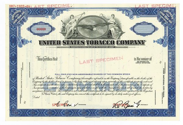 New Jersey. <100 Shares Common Stock Specimen Certificate, Black print on blue border and under tint, Allegorical figure at top flanking Bald Eagle in flight, Specimen overprints and POC's, VF-XF condition, ABNC.