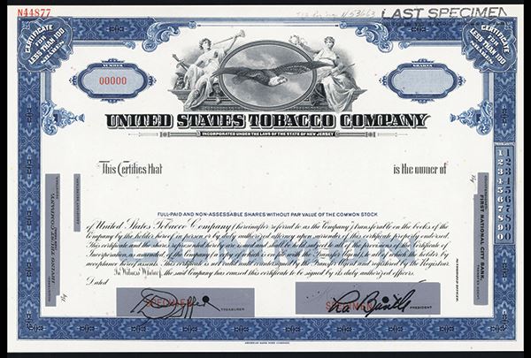 New Jersey, 19xx, <100 Shares, Specimen Stock, Black on blue border and underprint, Soaring Bald Eagle top center flanked by two sitting allegorical figures, VF-XF condition, ABNC.