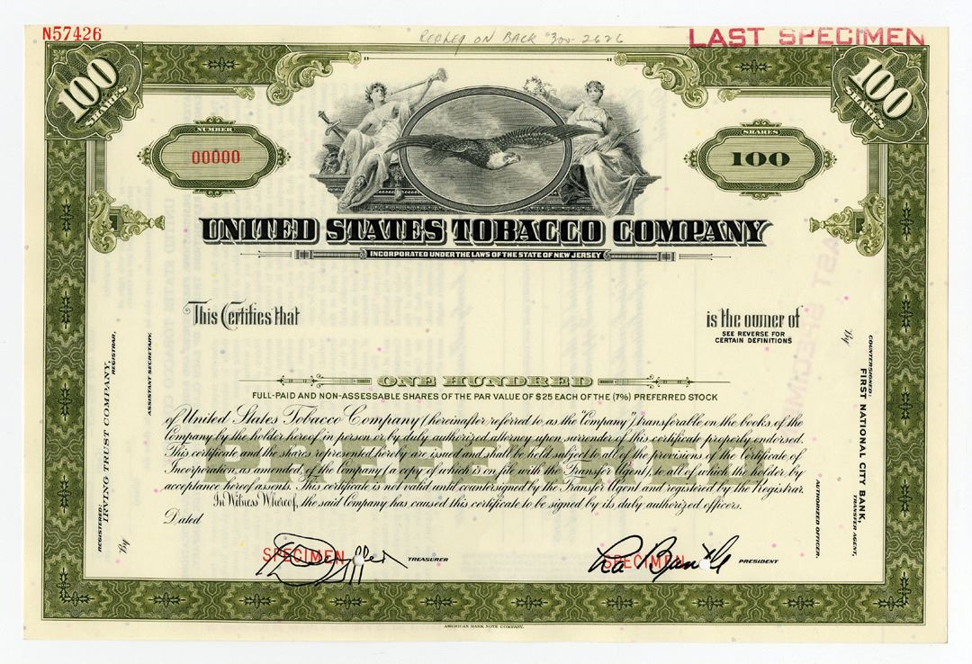 New Jersey. 100 Shares Common Stock Specimen Certificate, Black print on green border and under tint, Allegorical figure at top flanking Bald Eagle in flight, Specimen overprints and POC's, VF-XF condition, ABNC.