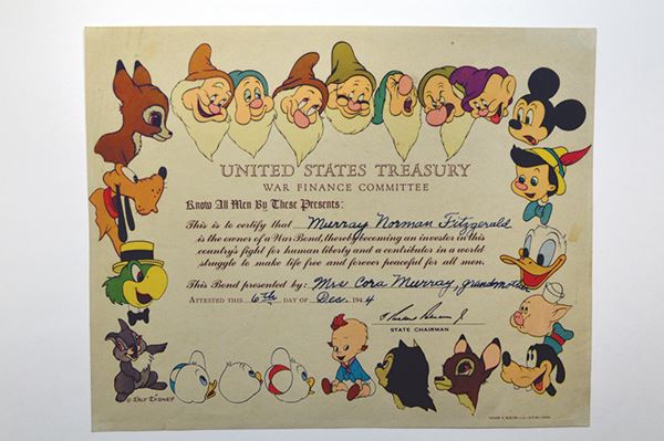 Washington DC. U.S.Treasury War Finance Committee. 1944 Disney Certificate featuring many characters as border design for purchasing a War Bond.