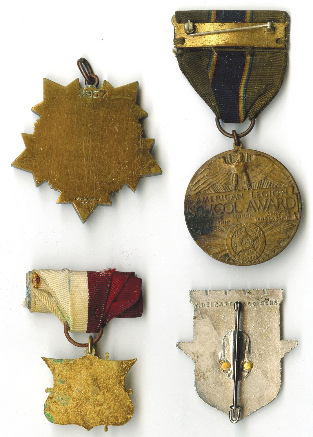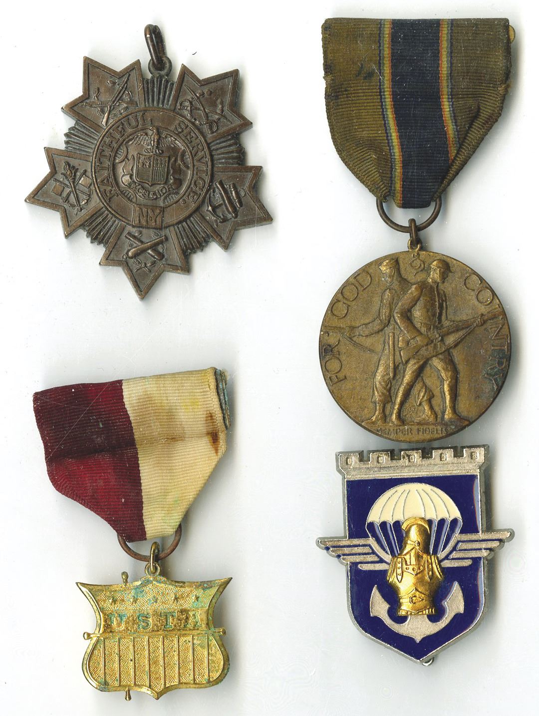 New York.... Lot of 4 medals: American Legion School Award, olive and navy ribbon, Pair of soldiers on obverse with "For God & Country" surrounding, obverse features an eagle atop "American Legion School Award" print; New York Faithful Service Medal, "Excelsior" and eagle at center, surrounded by various arms all held within a 5 pointed star. reverse is blank except for "3957" and mint mark. This piece was awarded for satisfactory active service in various New York State regiments; Parachute badge with blue background, golden figure at center with naval anchor below, wings to left and right, and parachute at top; "U.S.T.A." golden medal with red and white ribbon. VF to XF condition. (4)