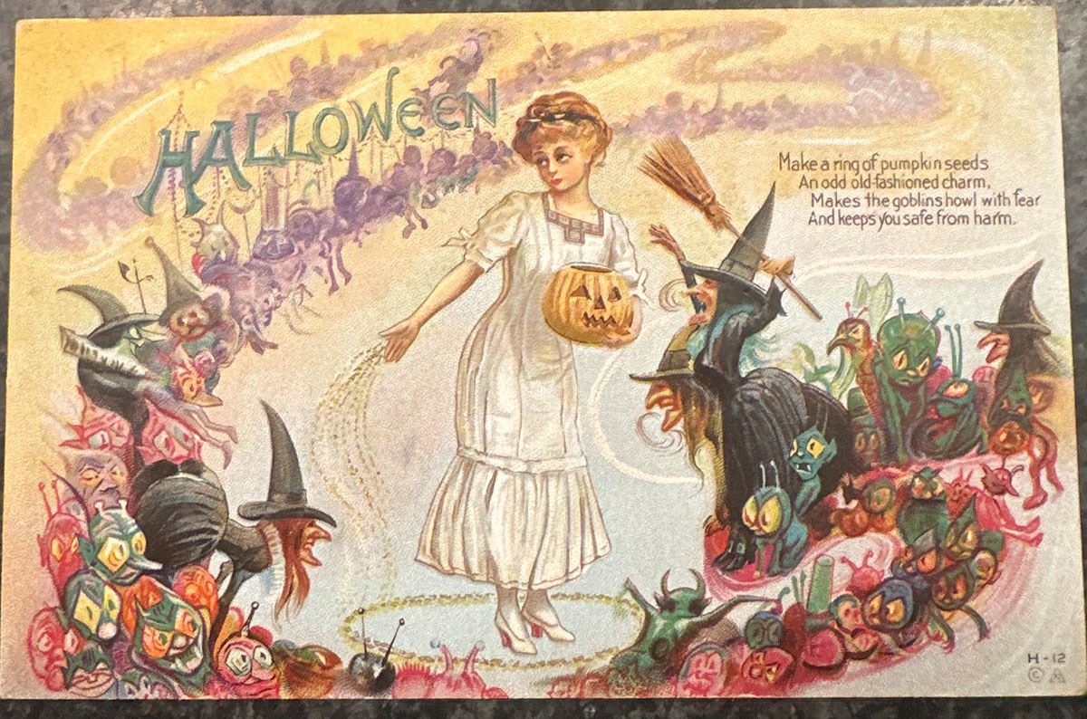 Beautiful early embossed Halloween postcard depicting a young girl holding a jack-o’-lantern while surrounded by colorful goblins, witches, and fantastical creatures; printed Halloween verse at right; unused ornate 'Post Card' back with one-cent/two-cent postage box; marked H-12. Highly collectible early Halloween issue.
