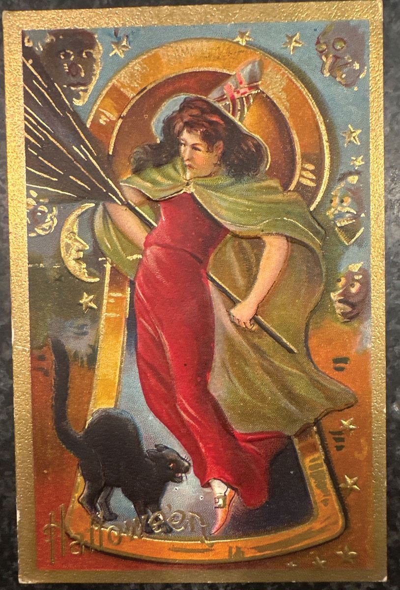 Striking embossed Halloween postcard featuring a dramatic witch in a flowing red gown and green cape, holding a broom and framed within a large golden arch; black cat at bottom; ghostly faces, moon, and stars in background; brilliant gold border; divided back marked Halloween Series No. 3; unused.