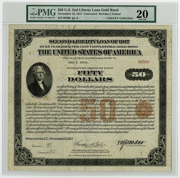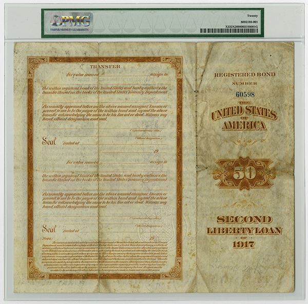 Washington, D.C., 1917, $50, Second Liberty Loan of 1917, 4% Convertible Gold Registered Bond, issued Nov. 15, 1917. A rare registered bond that was issued without coupons. These registered bonds had checks mailed directly to the registered owner, which in your cataloguers opinion makes them rarer than the more readily available bearer bonds as there was little additional evidence of their existence. This is only the second one ever seen in modern times. Black and Brown print on cream paper. Engraved Treasury officers signatures, Jefferson Vignette on obverse. Embossed U.S. Treasury Seal. Brown print on reverse with Transfer documentation for review. Printed by the BEP.