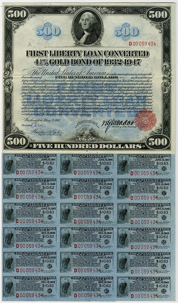 Washington, D.C. 1918, $500, United States of America, 4.25% First Liberty Loan Converted "Long" Coupon Bond. This is only the second $500.00 Liberty Loan bond ever seen by your cataloguer and the only one known to exist of this series. This exceedingly rare bond is vibrant in its' color and striking in design. Vignette of Washington on obverse. Engraved Teehee/McAdoo signatures. Beautiful Blue tint and apple red Treasury Seal and serial number. Only coupons 5 and 6 have been redeemed since this long bond picked up from where the "short series" First Liberty Loan 4 .00 % Convertible Gold Bond of 1932-1947 left off, which contained coupons 1-4. This particular series of bonds is considered by your cataloguer the "most patriotic" of the series as the reverse in Dark Blue depicts three "Doughboys" in full charge with bayonets out and "Old Glory" in full display. A must for the patriot in your family. (From the John E. Herzog Collection).