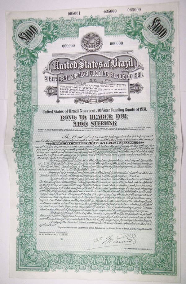 Brazil... £100 Specimen 5% 40-Year Funding Bearer Coupon Bond, black print on green border and under tint, Coat of Arms at top, POC's, annotations, VF-XF condition, BWC.