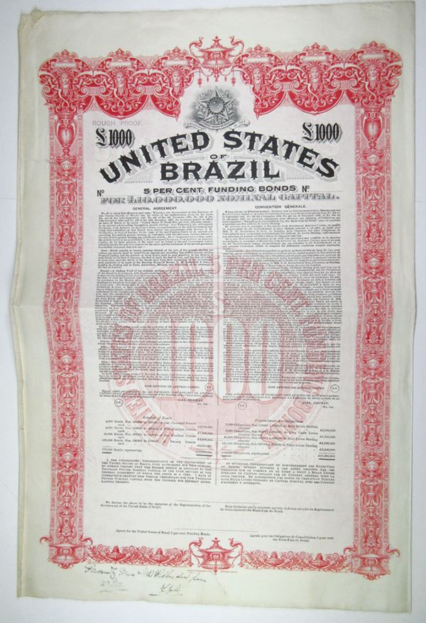 Brazil.... £1000 Proof 5% Funding Coupon Bond, black print on red border and under tint, Coat of Arms at top, annotations in bottom margin, VF condition, BWC.