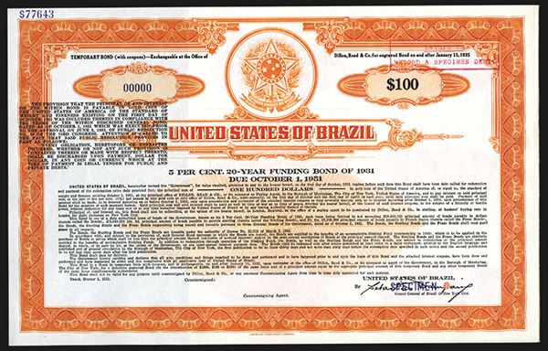 Temporary bond with coupons exchangeable at the office of Dillon, Read & Company. $100 5 Per Cent 20-Year Funding Specimen Bond of 1931, orange frame and Brazilian five-pointed star shield, endorsement that notifies potential bond holders that principal and interest is no longer payable in gold coins; any coins or currency that are legal tender may be used. Specimen bonds with this printed endorsement are rarely encountered and should be worth a premium bid.