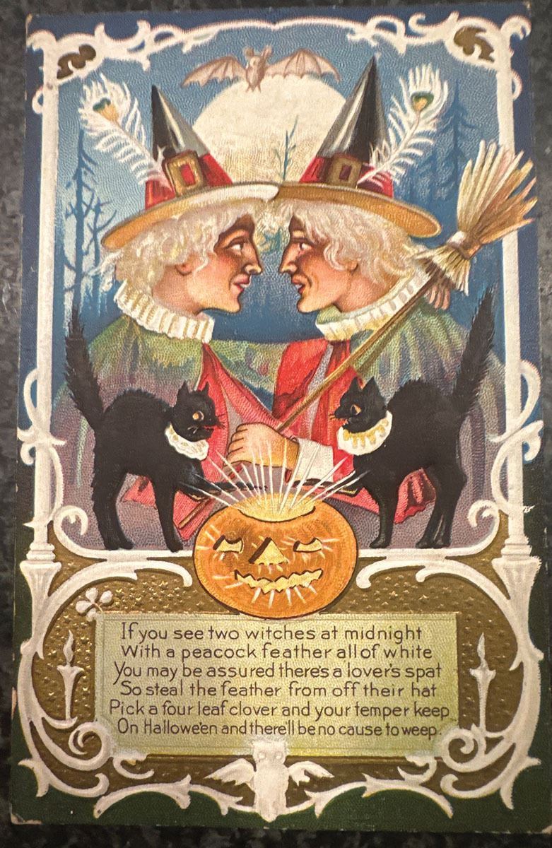 Embossed Halloween postcard with two witches facing each other under a full moon, each wearing pointed hats with peacock feathers; glowing jack-o’-lantern below, black cats at each side, and a bat in the moonlit sky; ornate white scroll border and printed Halloween verse; postmarked 1913 Lebanon, N.Y. with one-cent stamp; marked Series No. 7.