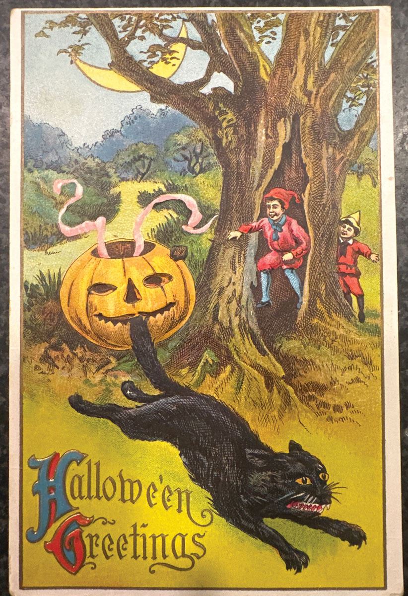 Early Halloween postcard showing a leaping black cat startled by a jack-o’-lantern trap set by two mischievous children peeking from behind a tree; colorful nighttime scene with crescent moon, forest background, and classic early Halloween styling. Captioned “Hallowe’en Greetings.” Reverse bears a 1914 Balston Spa, N.Y. postmark, one-cent Washington stamp, and handwritten message. Strong colors and desirable black-cat theme, among the most collected motifs from the period.