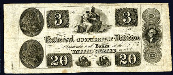 New York, 18xx (ca. 1830-40), Multi-denominations, 8 x 3.25 inches, uniface, black with no underprint, Seated allegorical women with sailing ships in background, small eagles on bottom, Washington counterfoil on right, two cameo heads on left and numerical medallions on note. Small numbers are on each design element, evidently as a reference for a description or for identifying vignettes wanted on banknotes, Printed by J.Clark and engraving by H.C. Foote. Choice Fine to VF condition. First time seen by cataloger. (ex. Auction #90, R.M. Smythe, NY Grand Sale 1990, Lot 1920)