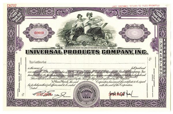 Delaware, ND (1914). <100 Shares Specimen Capital Stock Certificate, Black text with purple border and underprint, Pair of allegorical women at top center. Red specimen overprints, 00000 serial number, POCs. VF condition, ABNC.