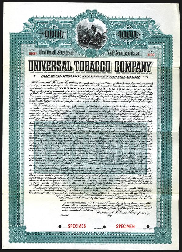 NJ. $1000 Specimen 6% Gold Coupon Bond, Black on green border and underprint, Slaves picking tobacco on top, Specimen overprints, POC's, VF, ABNC. Rare tobacco related bond.