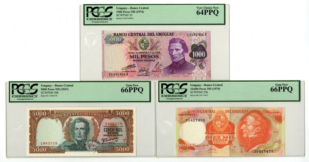 Uruguay, ND (1967). Lot of 3 Issued Banknotes, Includes: ND (1967), 5000 Pesos, P-50b, PCGS graded Gem New 66 PPQ; ND (1974), 1000 Pesos, P-52, PCGS graded Very Choice New 64 PPQ; ND (1974), 10,000 Pesos, P-53b, PCGS graded Gem New 66 PPQ. (3). Sold "AS IS" no returns accepted.