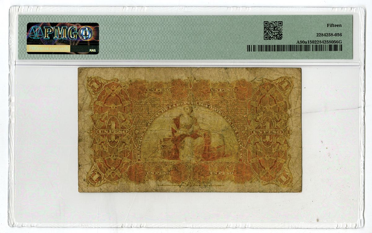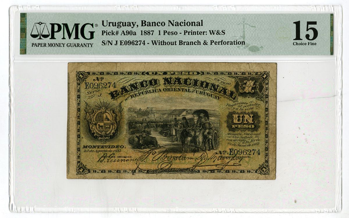 Uruguay, 1887. 1 Peso, P-A90a, Issued Banknote, Black on green and orange underprint with arms at left and village at center, Back is Orange with seated woman at center, S/N J E096274, Without Branch & Perforation overprint, PMG graded Choice Fine 15, W&S.