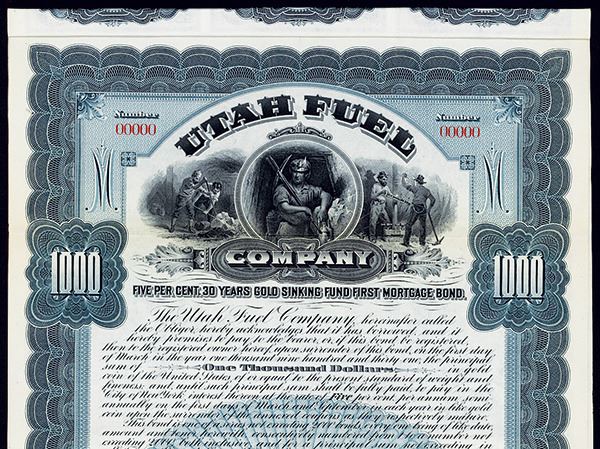 Utah, 1901, $1000, 5% 30 Year 1st Mortgage Sinking Fund Gold Specimen Bond, Black on blue border and under print, Mining scene vignettes top center, POC's red SPECIMEN overprints and red s/n "00000", VF condition, ABNC.