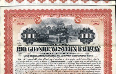 1899. $1,000. Specimen 1st Consolidated Mortgage 4% Gold Bond. Orange-red border. Train passing people and horses. Red specimen overprints, POC's and "00000" serial numbers. Coupons attached. XF condition. Rare certificate. Unlisted variety in Cox. ABNC.
