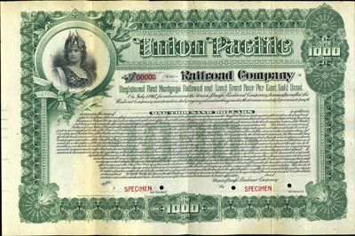 1897. $1,000. Specimen Registered 1st Mortgage Railroad and Land Grant 4% Gold Bond. Green border. Helmeted woman on left.. Red specimen overprints, POC's and "00000" serial numbers. XF condition. Rare certificate. Unlisted date variety in Cox. ABNC.