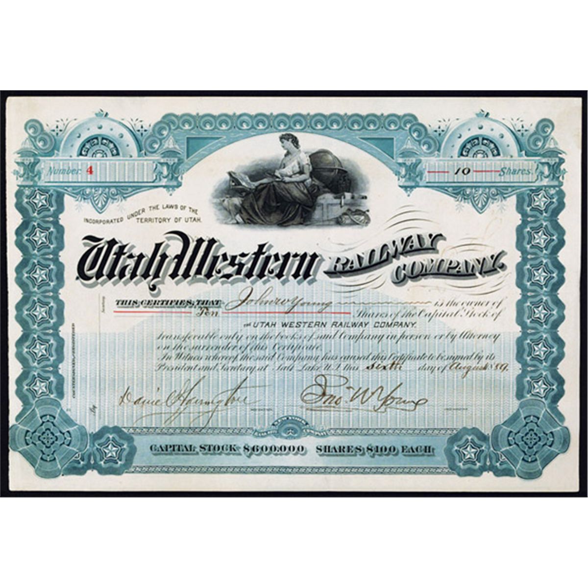 Utah Territory, 6th August 1889, 10 Shares, Issued and uncancelled, Cert. #4, Black with green border and underprint, allegorical woman with globe, mirror and book, XF condition, signed by John W.Young as president and Davie Harrington as Secretary. The Utah Western Railway was organized by John W. Young and his associates to build a narrow gauge railroad north and west of Salt lake City, west to Great Salt lake, and on to the vicinity of Black Rock on the south shore of the lake, a distance of about 30 miles. It included his brother Bringham Young Jr. and other Mormon leaders as shareholders.