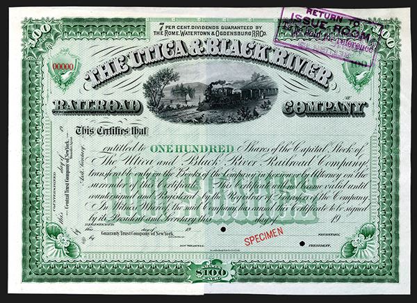 New York, 100 Shares, Specimen, Black on green under print and border, locomotive R-L passing a lake,, "7% Dividends Guaranteed by the Rome, Watertown & Ogdensburg RR.Co.", Amazing colors and design, XF, Franklin BNC, earlier 1800's design updated by ABNC with small ABC monogram. Rare and Unlisted in Cox.