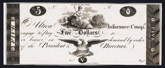 Utica, New York, ND (ca.1810's), $5, (Harris-H260), Haxby unlisted, black on india paper, Athena on shore at top middle, Phoenix in fire at bottom, Appears Uncirculated to CU condition. Leney & Rollinfon, scarce early New York obsolete proof in superb condition. (Ex Smythe & Co., Auction 247, Mar. 23, 2005, Lot #4623, sold for $575)