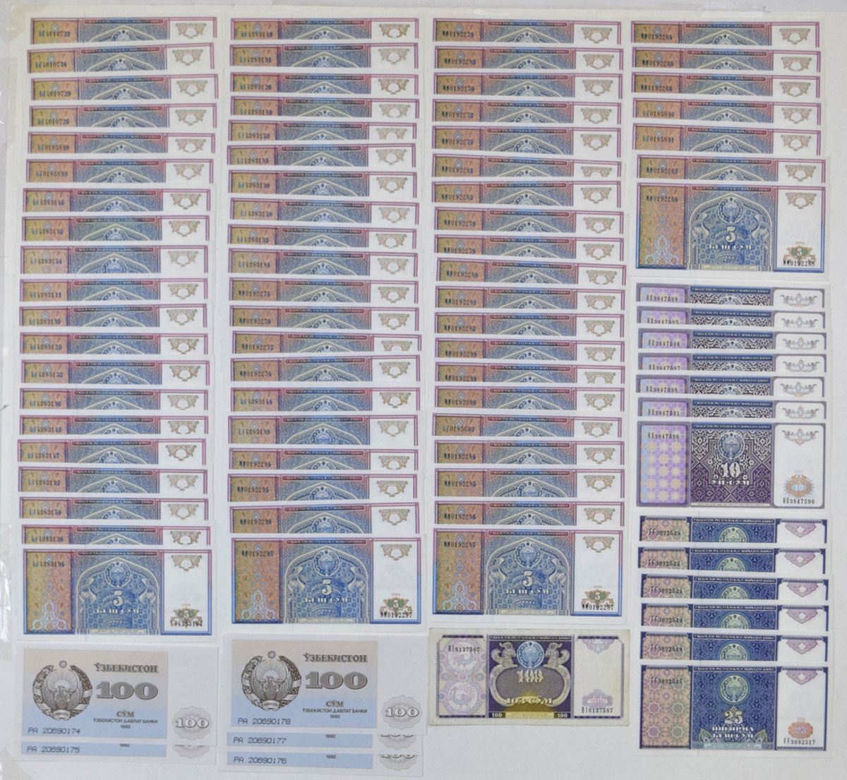 Uzbekistan, 1992 (1993)-94. Lot of 80 Issued Banknotes, Includes: Bank of Uzbekistan, 1992 (1993), 100 Sum, P-67a (5), Sequential Notes, H& S; Central Bank of Uzbekistan, 1994, 5 Sum, P-75a (61); 1994, 10 Sum, P-76a (7) Sequential Notes; 1994, 25 Sum, P-77a (6), Issued Banknotes; 1994, 100 Sum, P-79a. All but 1 note is in Uncirculated to CU condition . (80). Sold "AS IS" no returns accepted.