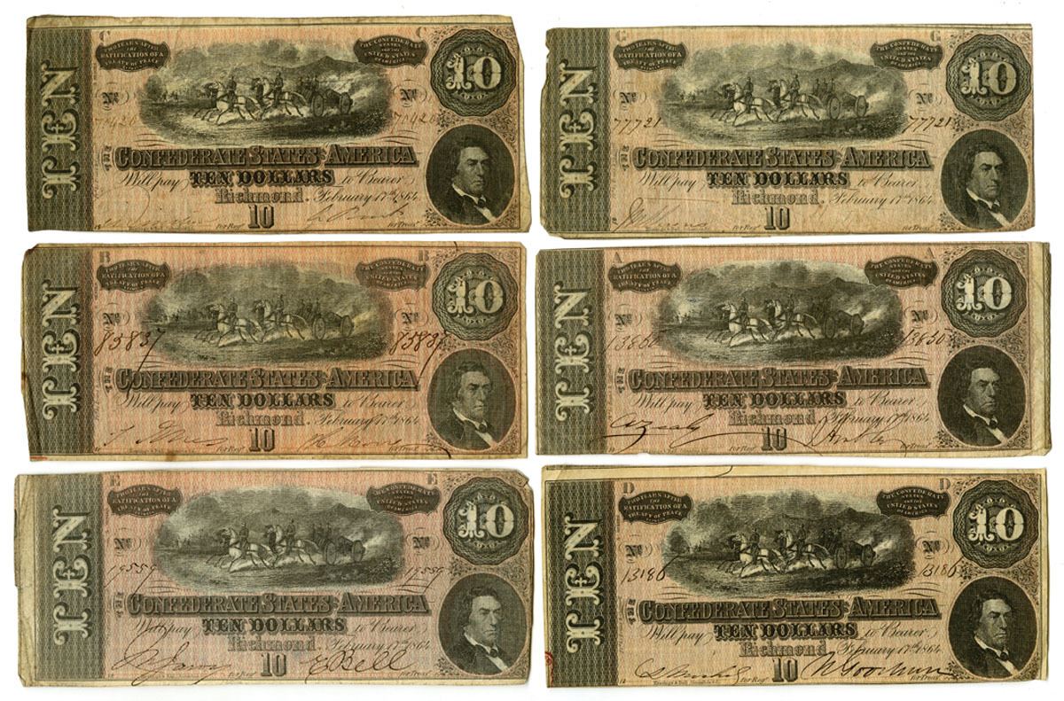 Richmond, Virginia, 1864. $10, P-68 (6) T-68 SL#69, Issued Banknote Group, Black on red underprint with Artillery horseman pulling cannon at center with portrait of M.T. Hunter at lower right, Back is blue with TEN printed at center, Notes range from VF to Choice VF condition. (6). Sold "AS IS" no returns accepted.